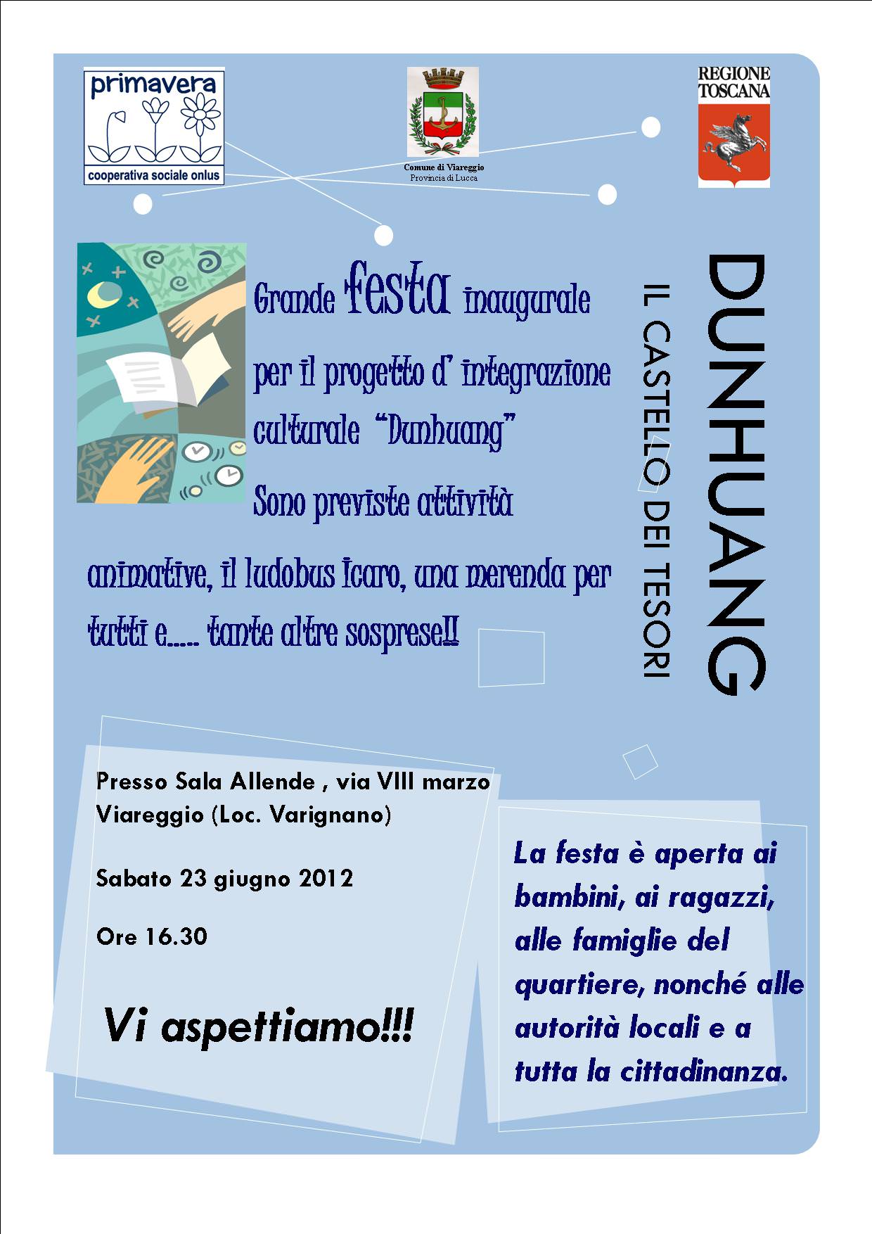 VIAREGGIO. La Cooperativa Sociale Primavera organizza la festa inaugurale del Progetto Dunhuang- il castello dei tesori– che si terrà il giorno sabato 23 giugno alle ore 16.30 preso la Sala Allende, via VIII marzo, Quartiere Varignano.