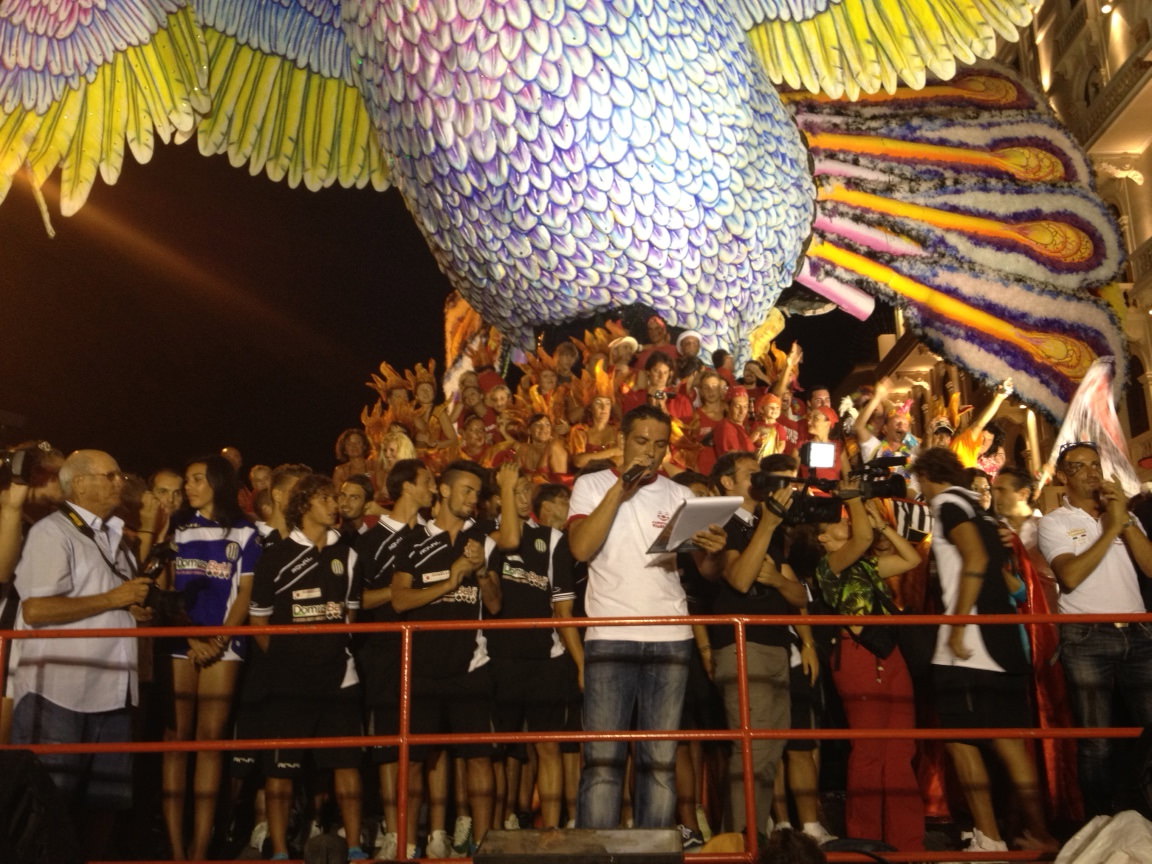 I giocatori con lo staff tecnico e la dirigenza sono saliti sul carro dei fratelli Bonetti “Phoenix” che si è fermato di fronte all’hotel Principe di Piemonte: qui Daniele Maffei, uno dei tre conduttori della serata assieme a Loris Marchi e Stefano Pasquinucci, ha presentato uno ad uno tutti i giocatori.