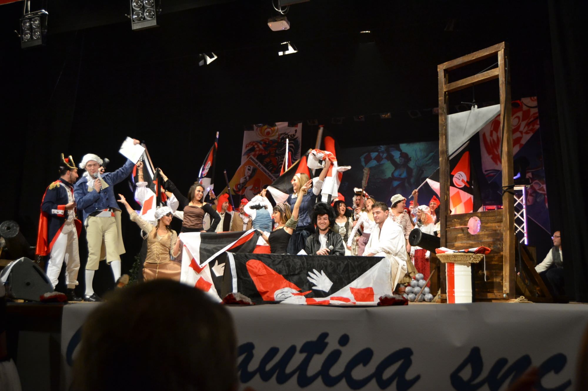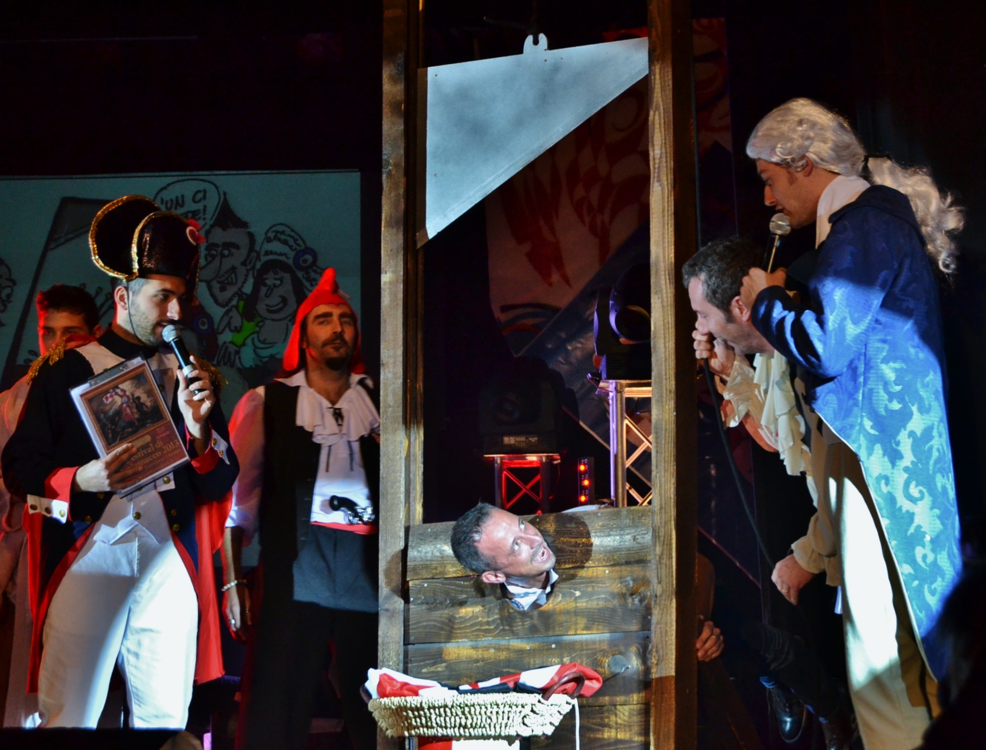 Il Festival. Davanti a un teatro Jenco da tutto esaurito l’ormai collaudato quintetto di conduttori Luca Bonuccelli, Andrea Paci, Leonardo Dati, Simone Casani e Federica Michetti è sapientemente riuscito a intrattenere la platea tra sketches, siparietti e improbabili collegamenti che hanno regalato risate assicurate. Dalla simulazione del rione Darsena con tanto di ricostruzione della via Coppino e del Cro al “Festival dei Reietti”, direttamente dai bagni del teatro Politeama considerate le casse in lacrime di Re Carnevale, fino alla fiction “I Francesconi”, la famiglia di carristi capeggiata da un incontenibile Aurelio alle prese con traslochi dagli hangar, Santini e Cinquini. Filo conduttore della kermesse è stata la Rivoluzione francese – anzi delle maschere – per risvegliare l’anima carnevalara dei viareggini ormai assopita dalla crisi. E per rimanere in tema, come avveniva nella Francia di Robespierre, il Presidente della Fondazione Alessandro Santini è stato ghigliottinato in piazza.