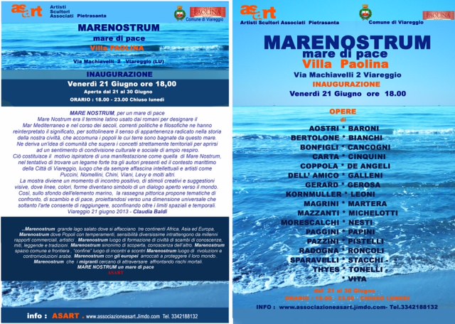 VIAREGGIO. Con il patrocinio del Comune di Viareggio, Asart (Artisti Scultori Associati Pietrasanta) ha organizzato una collettiva evento dal titolo “Marenostrum Mare di pace”.