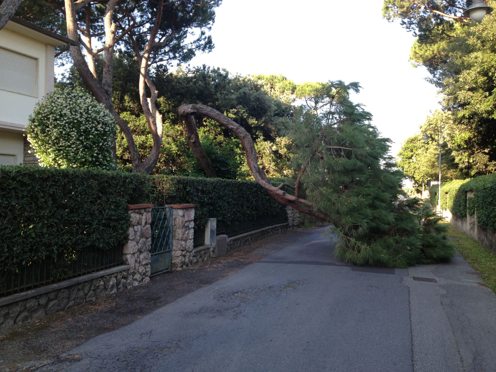 PIETRASANTA. Albero caduto in via Astoria a Marina di Pietrasanta. Un tronco di pino, interno a una abitazione in località Focette, si è staccato dall’albero andando ad intralciare il tratto di strada che porta al mare e che ha causato non pochi disagi a veicoli e pedoni che questa mattina hanno attraversato la via.