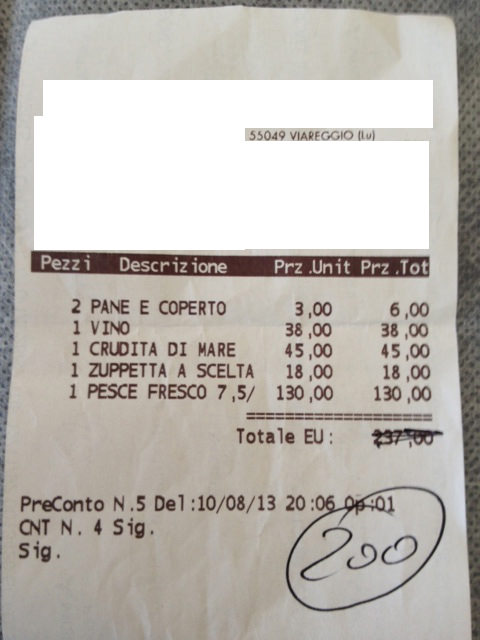 L’uomo, assieme alla moglie, ha speso la bellezza di 237 euro. Si è seduto ad un ristorante di Viareggio, e già erano partiti 6 euro per il coperto. Poi hanno preso una bottiglia di vino (38 euro), una crudità di mare (45 euro), una zuppetta di pesce (18 euro) e infine un pesce fresco che, da solo, è costato 130 euro.