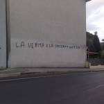 L’altra, una frase lasciata a metà, è stata fatta, con stessa calligrafia e stesso spray nero, sul muro di una casa, quella che affaccia davanti il palazzo comunale, di fronte al piccolo parcheggio e alla strada che porta alla Misericordia.