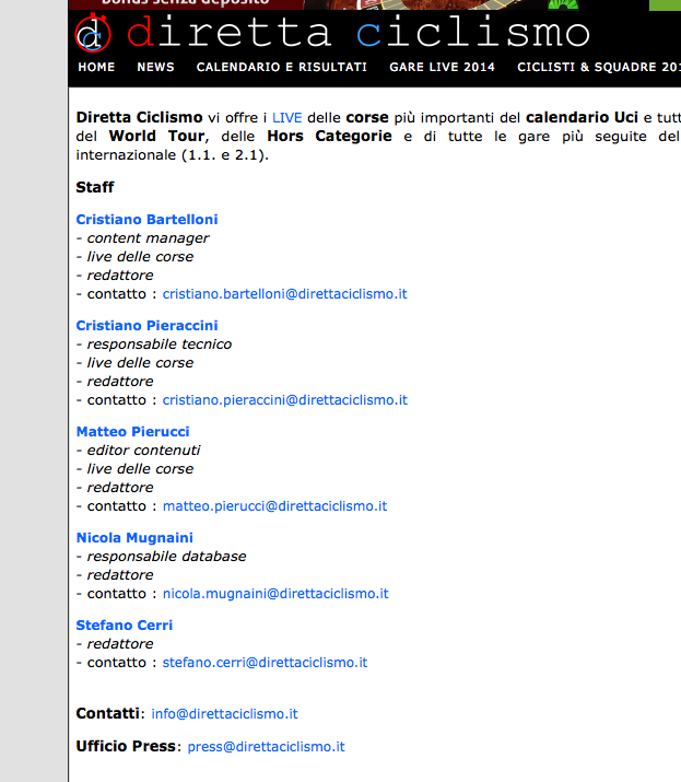 Per curiosità siamo andati a sbirciare su questo sito (diretta ciclismo) per capire da chi fosse gestito. E spuntano così nomi più o meno conosciuti a Camaiore. Nello staff ci sono Cristiano Pieraccini (a cui risulta registrato il sito), Nicola Mugnaini, Stefano Cerri, Cristiano Bartelloni e Matteo Pierucci.