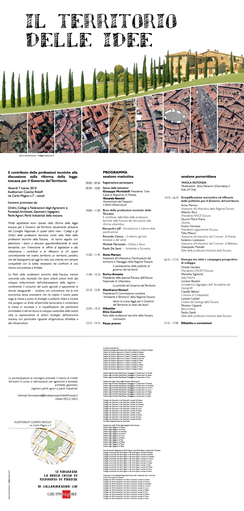 FIRENZE. È il convegno “Il Territorio delle idee”, in programma domani (7 marzo) a Firenze all’Auditorium della Banca CR Firenze (via Carlo Magno, 7) a partire dalle ore 9. Un’occasione di confronto ad ampio raggio sulla riforma urbanistica della Regione tra istituzioni, ambientalisti, intellettuali, soggetti economici e gli addetti ai lavori,organizzata dalla Rete regionale delle professioni tecniche della Toscana, che comprende gli Ordini di Architetti, Ingegneri, Geometri, Agronomi e forestali, Periti agrari, Periti industriali di tutte e dieci le province toscane e le relative sei Federazioni regionali.