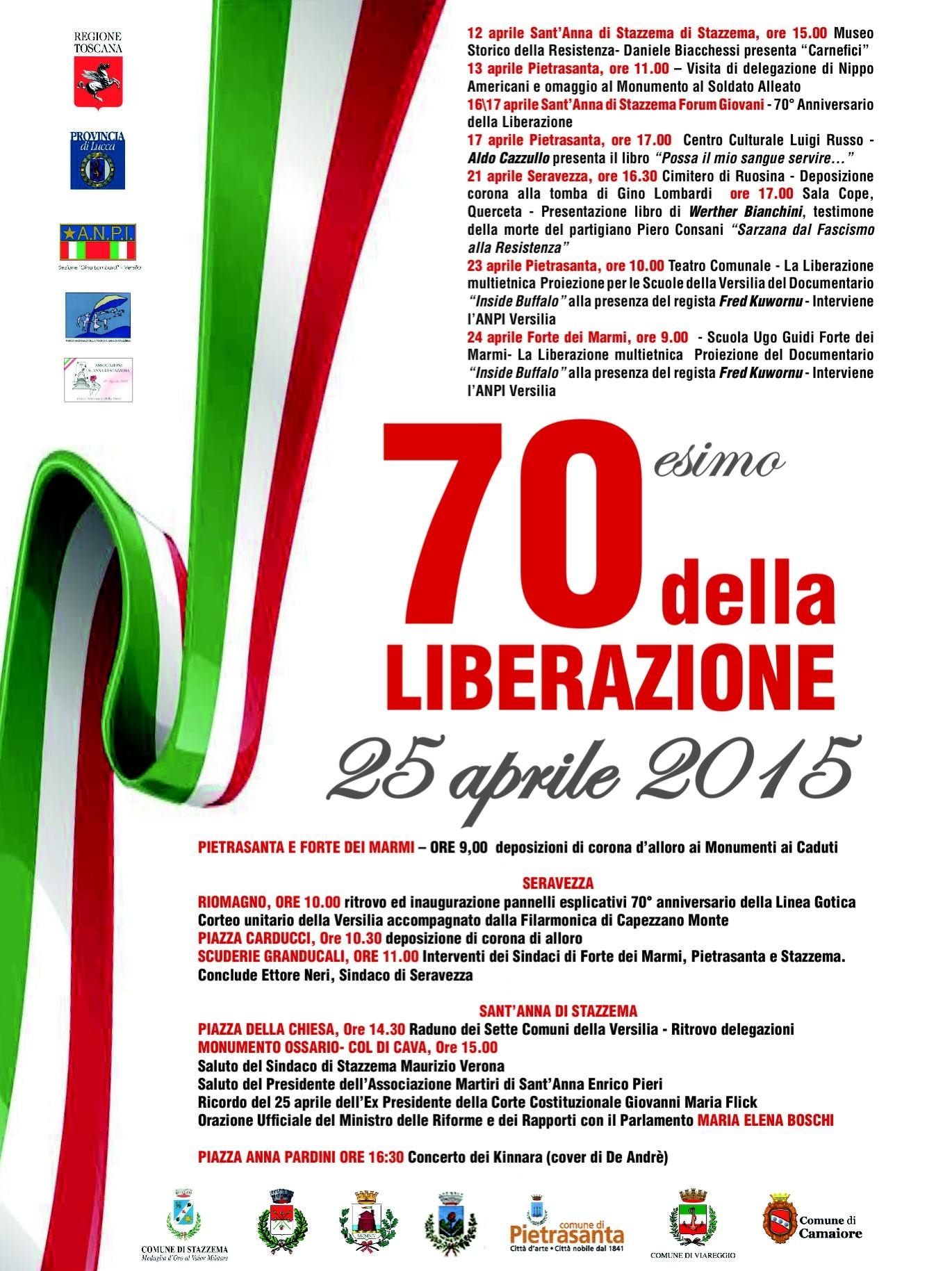 “Insieme alle amministrazioni della Versilia e con il coordinamento dell’Anpi di Pietrasanta abbiamo organizzato il calendario congiunto per le celebrazioni del 70° anniversario della Liberazione”, spiega il sindaco di Stazzema Maurizio Verona. “In tutto il territorio della Versilia saranno organizzati eventi culturali, incontri, proiezioni, presentazioni di libri coinvolgendo la popolazione ed in particolare le scuole ed i giovani, per trasmettere la conoscenza della storia che ha portato alla Liberazione del nostro Paese dal Nazifascismo.
