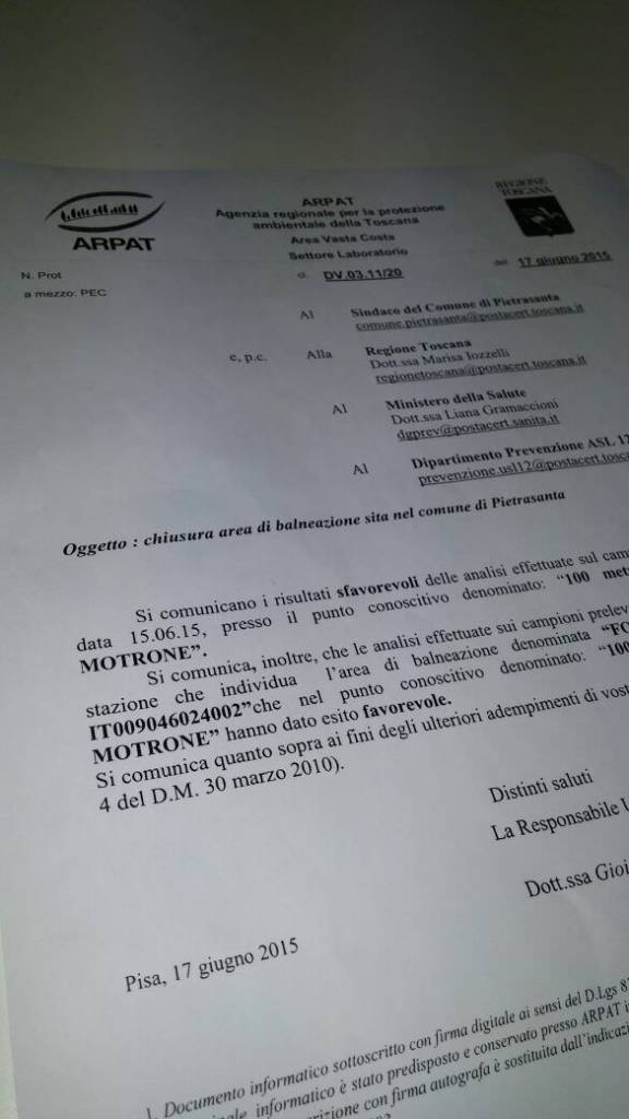 “Il fatto è accaduto lo scorso 17 giugno, quando il sindaco neoeletto ha ricevuto una lettera di Arpat che lo avvisava dei risultati sfavorevoli delle analisi effettuate su un campione di acqua prelevato in data 15 giugno presso il punto denominato ‘100 metri nord foce fosso Motrone’.