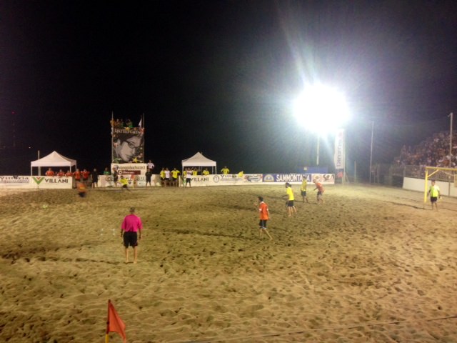 Ieri sera al beach stadium sulla diga foranea intitolato proprio a Matteo Valenti, morto nel novembre 2004 a seguito di un incidente sul luogo di lavoro, è stata la giornata delle finali di categoria, dagli Under 14 fino agli adulti. Un lungo pomeriggio di sport che ha toccato l’apice con la sfida decisiva tra Autoscuola Iacopini-Osteria 8 Etti-Hotel Bellariviera (in maglia arancione) e La Ghenga (in campo con una divisa giallonera simil-Borussia Dortmund).
