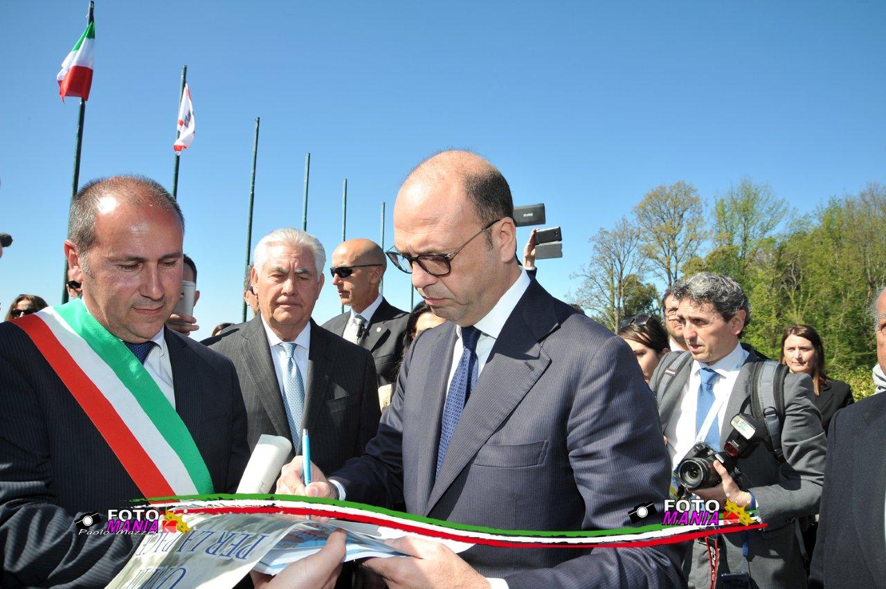 Il ministro degli esteri Angelino Alfano, l’Alto rappresentante dell’Ue per gli affari esteri Federica Mogherini e il segretario di Stato Usa Rex Tillerson a Sant’Anna di Stazzema.