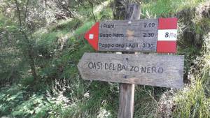 A sinistra la via prosegue verso Poggio agli Agli, a destra verso il Balzo Nero, raggiungibile in circa 30 minuti nel bosco (i faggi – e i castagni – salendo, sono sempre più radi).