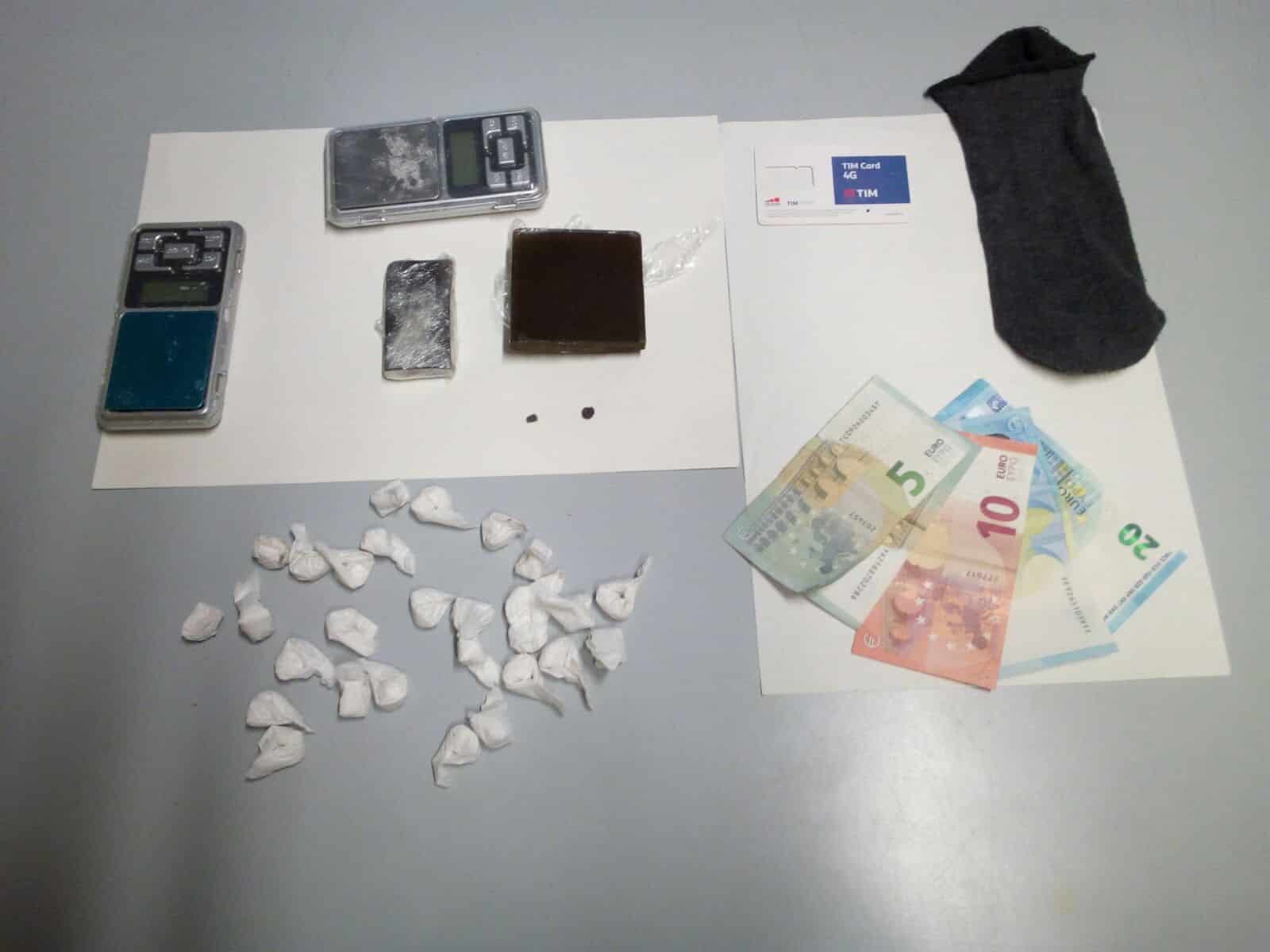 A questo punto è stato sottoposto a perquisizione personale ed è stato trovato in possesso di 28 gr. di sostanza stupefacente del tipo cocaina suddivisi in altrettante dosi, 80 gr. di sostanza stupefacente del tipo hashish, 60 euro in banconote di vario taglio, verosimilmente provento dell’attività di spaccio e due bilancini elettronici per la pesatura della sostanza.