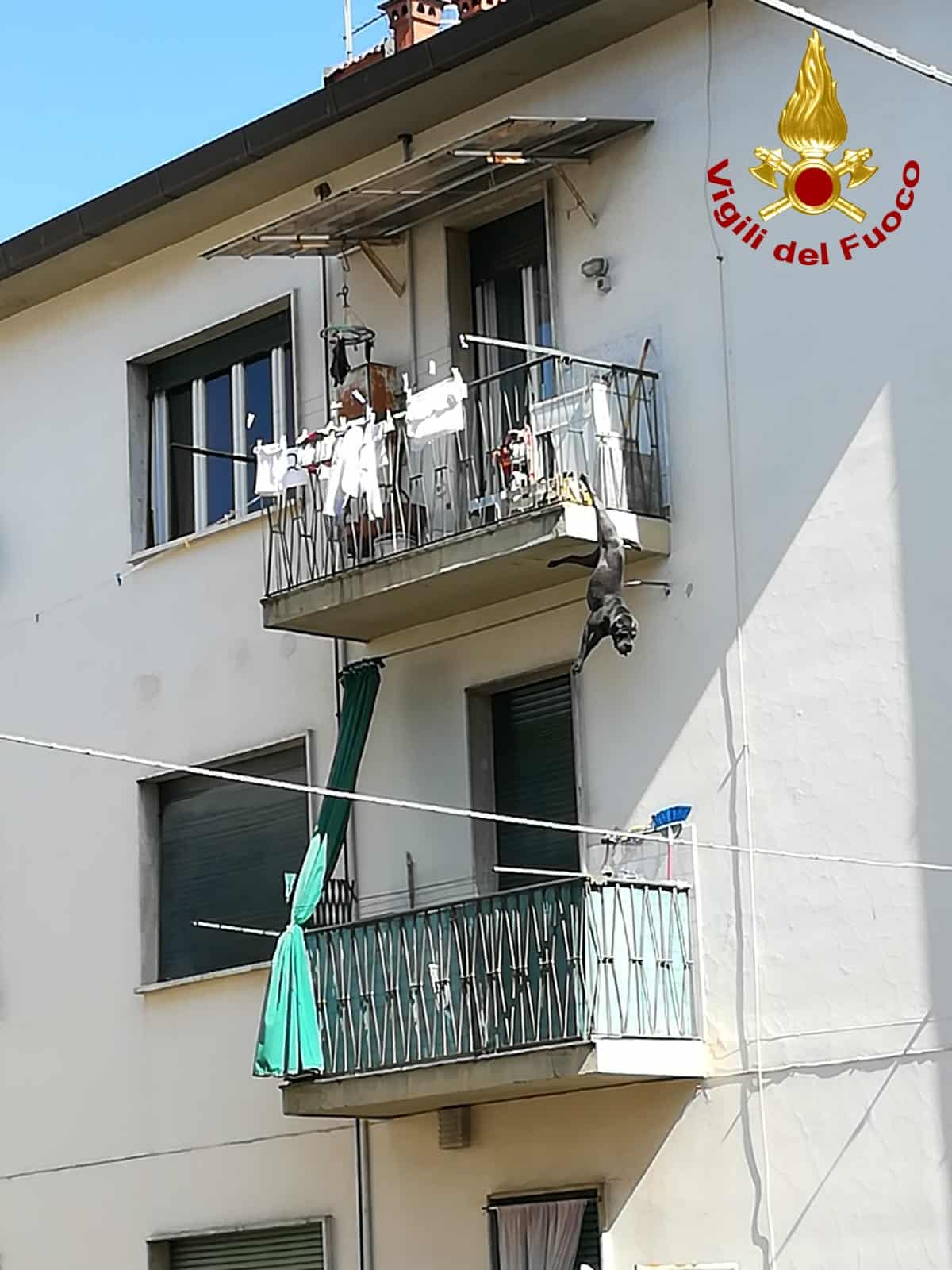 Un cane è rimasto appeso per una zampa alla ringhiera di una terrazza posta al 3° piano di un condominio.