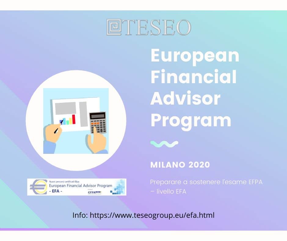Teseo – agenzia con sede a Milano e Camaiore (LU) – propone un corso certificato per il conseguimento della qualifica di European Financial Advisor che si terrà a Milano a partire da gennaio 2020. Quello proposto è un percorso formativo finalizzato alla preparazione necessaria per affrontare e superare l’esame per l’ottenimento della qualifica EFA – European Financial Advisor Program. Il corso ha una durata complessiva di 150 ore e presenta un modello didattico che alterna momenti di aula a momenti in autoformazione attraverso una piattaforma di e-learning dedicata (in totale 16 giornate di aula più una giornata finale di ripasso).