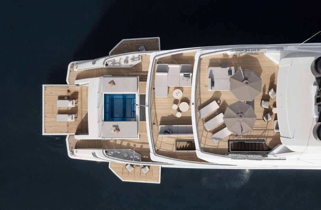 A cominciare dalla vastissima area privata della suite armatoriale, di ben 215 mq, nella zona upper deck, che, oltre a godere di una impareggiabile vista panoramica a 180°, è connessa in maniera funzionale all’area esterna di prua di oltre 140 metri quadrati, dotata di ampie aree prendisole e relax e piscina. Un intero ponte ad uso esclusivo dell’armatore, raggiungibile con un ascensore, che comprende oltre alla suite con due bagni e walk-in dressing room, anche uno studio, un ambiente living e, a poppa, la Sky Lounge di 67 mq, uno spazio riservato all’intrattenimento e al gioco completato all’esterno da una sala da pranzo all’aperto che assicura una vista panoramica mentre si pranza “al fresco”.