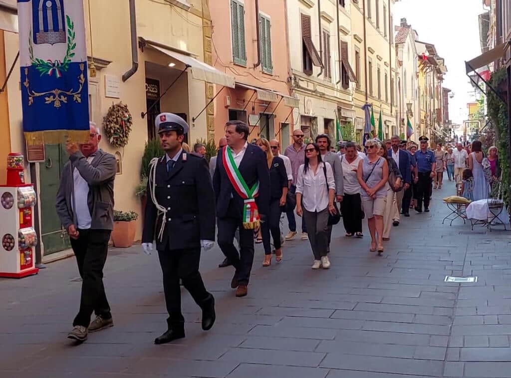 Dopo la partenza dal Municipio, la prima sosta in piazza Statuto: qui, il sindaco Alberto Stefano Giovannetti accompagnato da tutti gli assessori e da una rappresentanza dei consiglieri comunali ha deposto una corona di alloro in omaggio al monumento dedicato ai caduti della Prima e Seconda guerra mondiale.