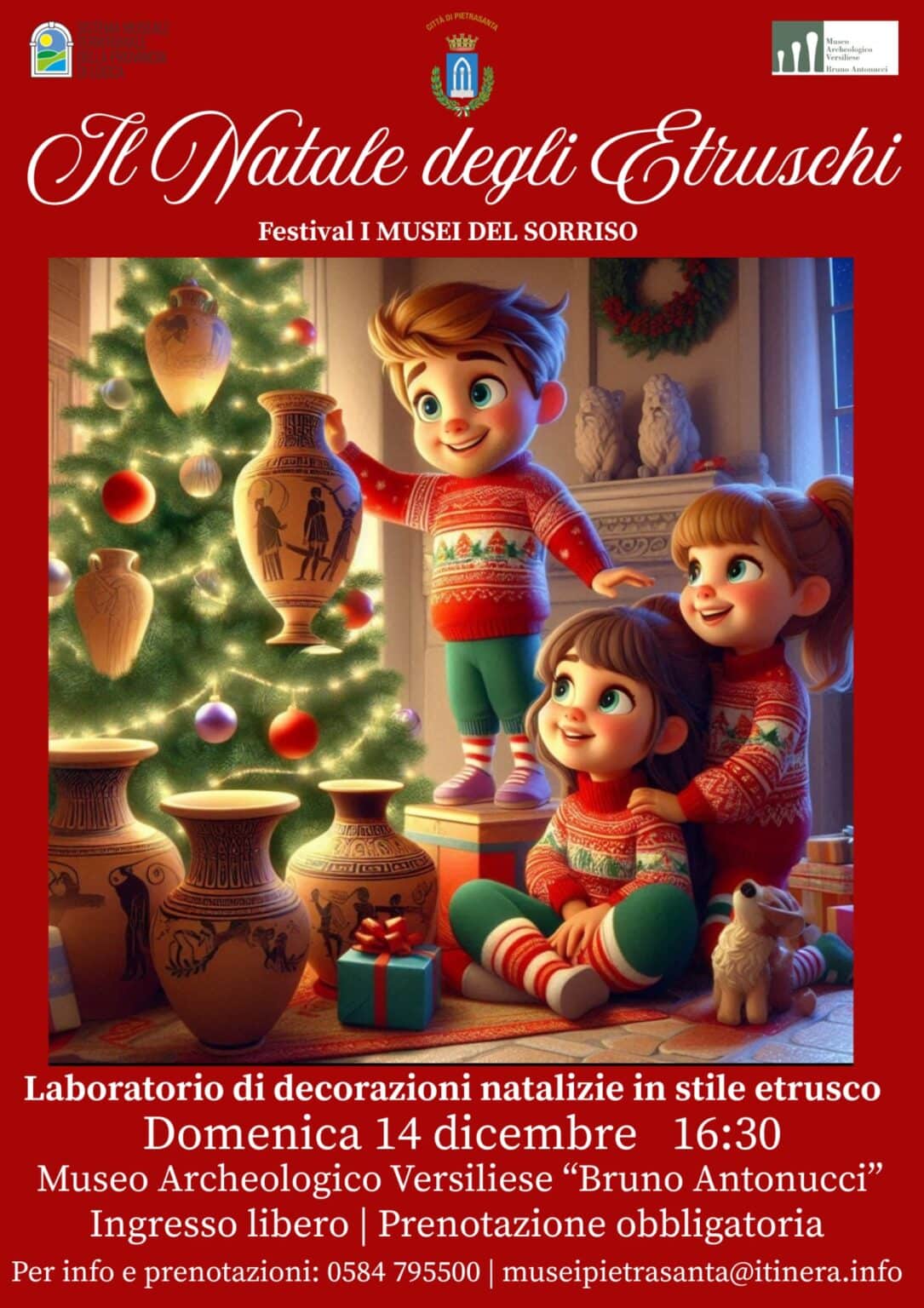 Iscrizioni aperte al laboratorio di decorazioni natalizie “Un Natale con gli Etruschi”, domenica 14 dicembre 2025 alle 16,30 al Museo Archeologico Bruno Antonucci di Pietrasanta, per l’ultima settimana del quarto festival “I Musei del Sorriso”,organizzato dal Sistema Museale Territoriale della Provincia di Lucca in collaborazione con Fondazione Toscana Spettacolo Onlus e con il sostegno della Fondazione Cassa di Risparmio di Lucca.